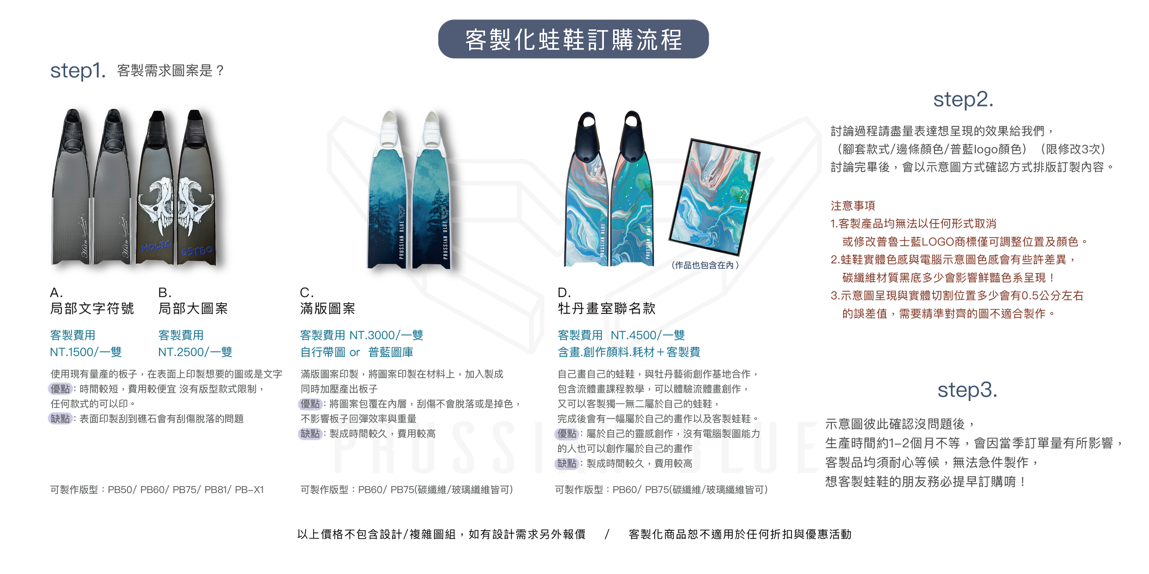 由於客製化蛙鞋屬於專屬訂製商品,一旦確認製作即無法退換貨。為了確保您獲得最合適的配置,請先與我們討論需求。
